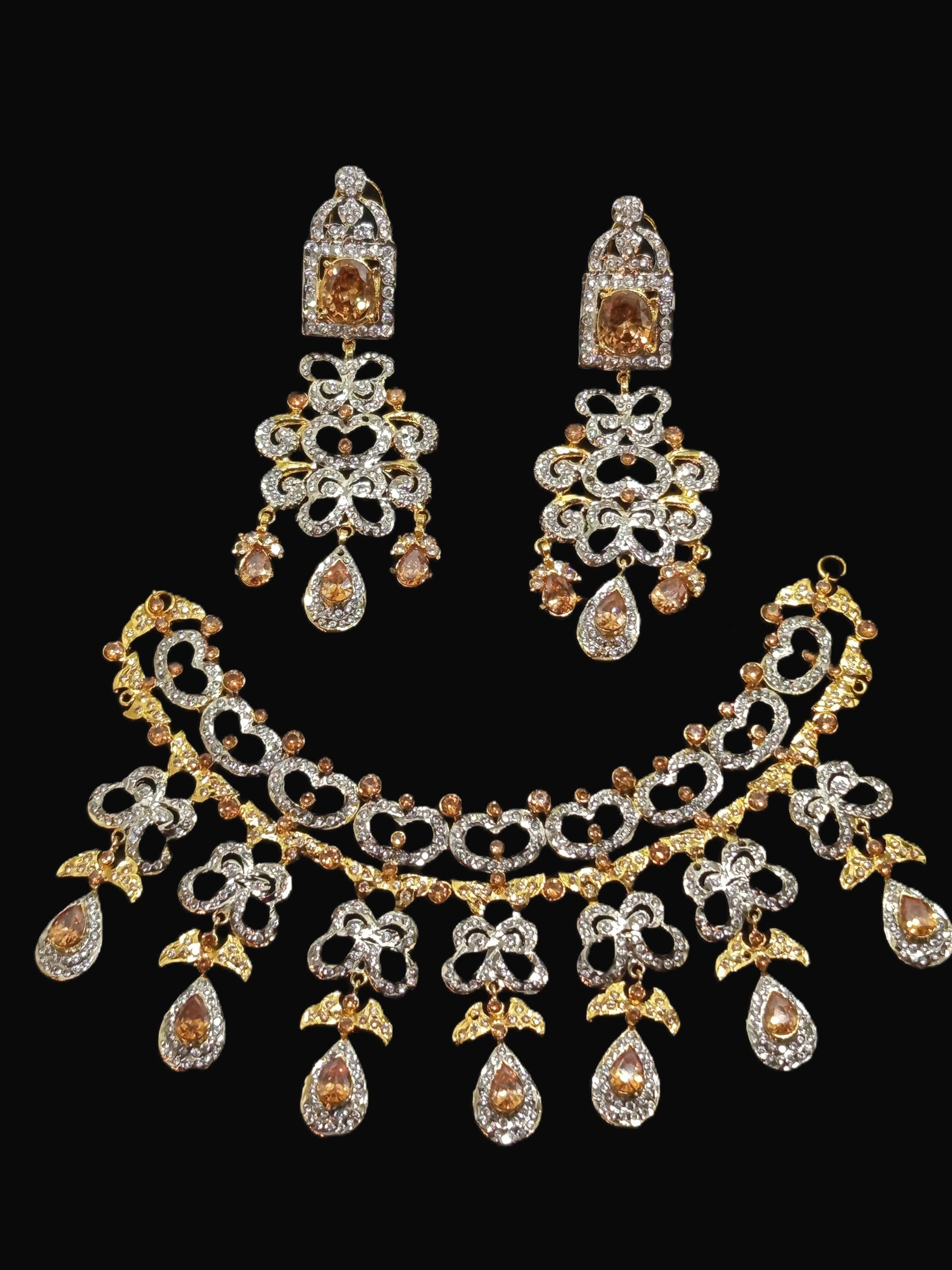 Elevate your jewelry collection with this exquisite three-piece necklace set from MODORO Pakistan. Crafted with champion crystals and sparkling zircons in a sophisticated two-tone finish, this designer piece delivers an unmistakably royal aesthetic. The long earrings complement the necklace perfectly, creating a cohesive ensemble that transitions seamlessly across any occasion. Whether paired with traditional attire or contemporary wear, this versatile set harmonizes beautifully with every color palette. Experience the refined elegance and timeless appeal that defines premium jewelry craftsmanship.