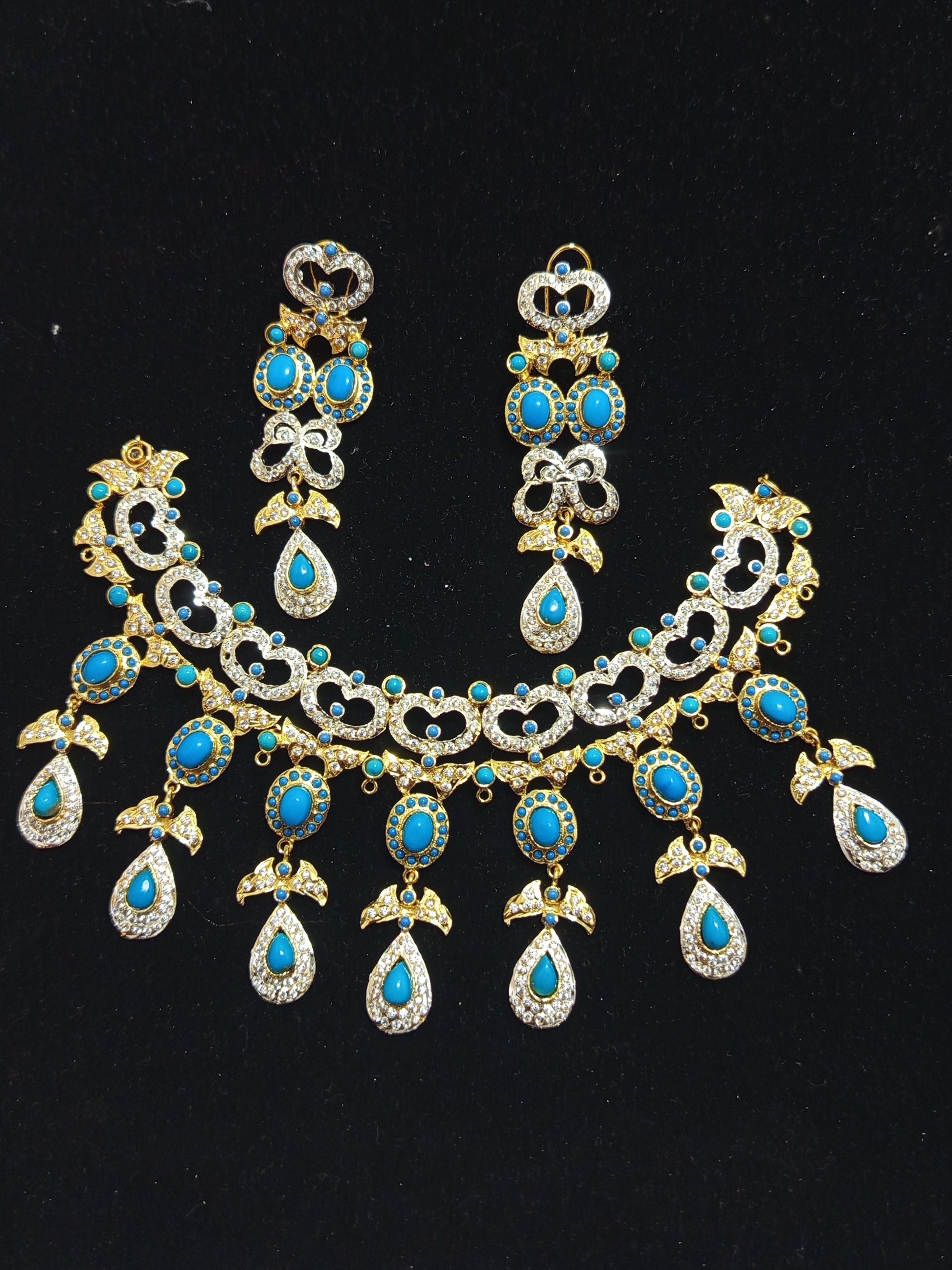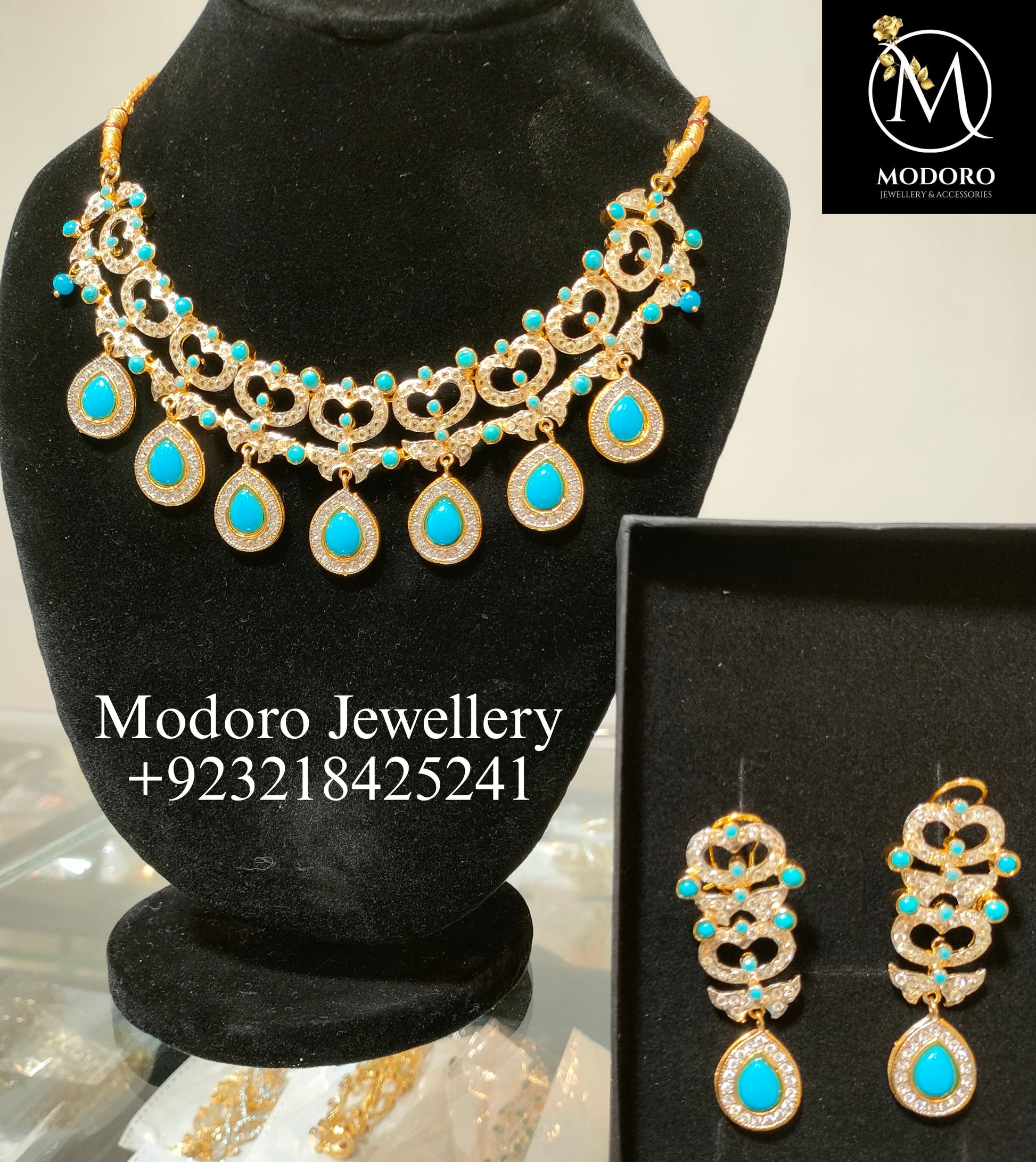 Elevate your ethnic ensemble with this exquisite Turquoise Necklace Set, crafted from premium feroza stones and brilliant CZ zircons. This designer piece features a sophisticated two-tone finish that complements both traditional and contemporary styles. The set includes a matching bindi, completing your look with refined elegance. Engineered for comfort, the lightweight construction ensures all-day wearability without compromising on luxury. Each piece reflects meticulous craftsmanship and exclusive design, available exclusively at MODORO—Pakistan's trusted jewellery destination for discerning customers seeking authentic, high-quality adornments.